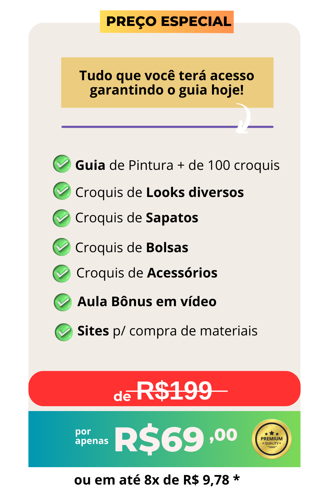 Além dos mais de 100 croquis você terá acesso a uma vídeo aula gravada ensinando o passo a passo para pintar seus croquis!