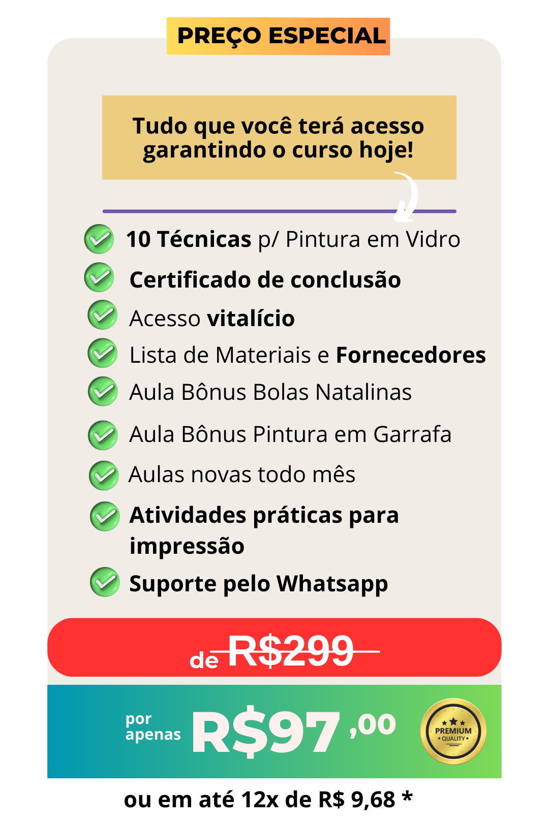 Nosso Curso Oferece Aulas Práticas para Iniciantes, Além de uma Lista de Fornecedores e Técnicas Valiosas para quem está começando do zero. Descubra Como Transformar a pintura em Vidro em Lucros Significativos, Podendo Alcançar até 10 Mil Reais por Mês!